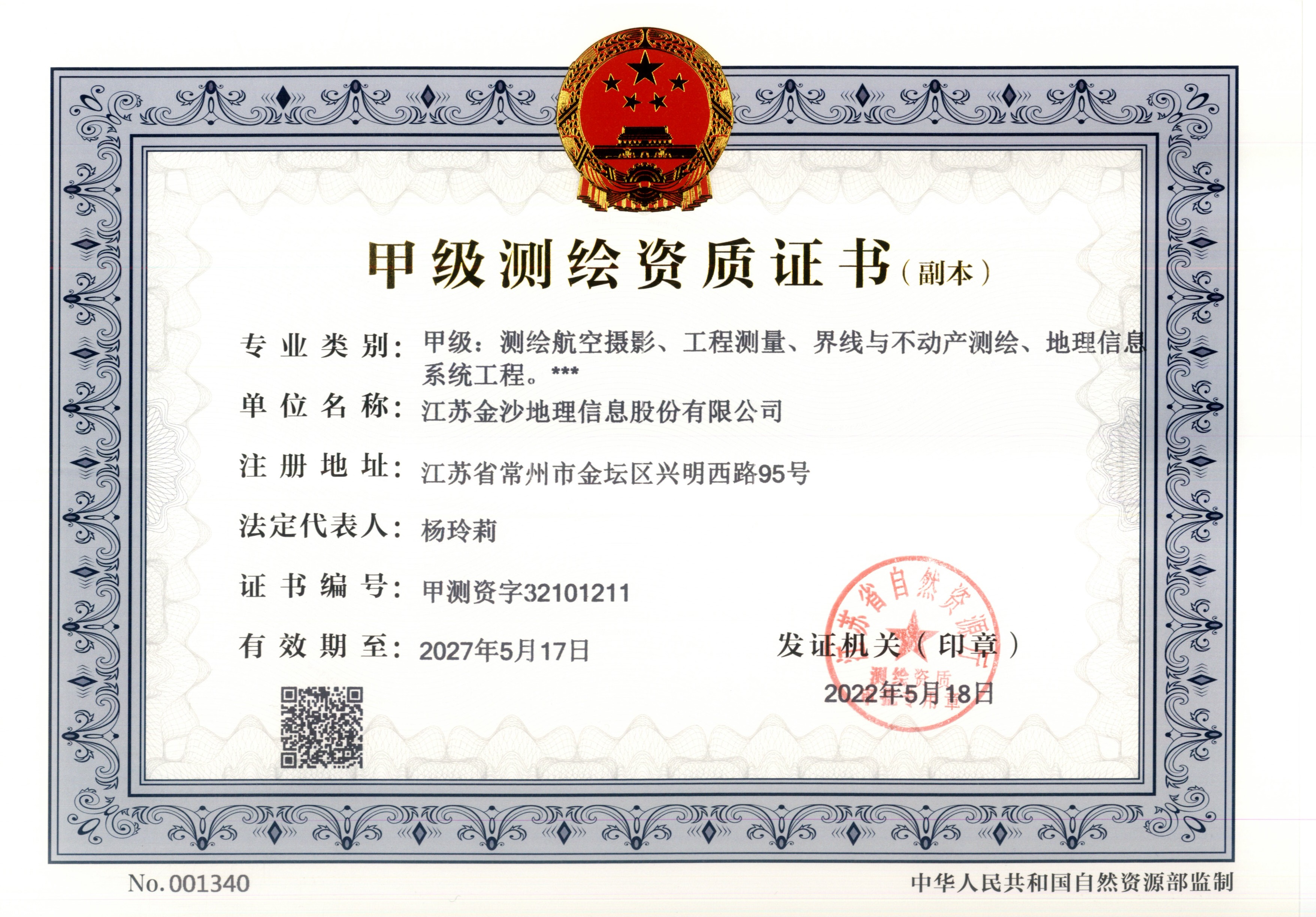 2022年5月18日,經江蘇省自然資源廳審核批準,江蘇金沙地理信息股份有限公司又迎來喜訊,公司榮獲甲級測繪資質。該資質獲得,對金沙地理承攬和開拓業務,提升公司競爭力及戰略發展具有重要意義。